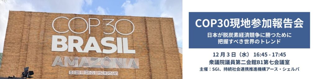 持続社会連携推進機構アース・シェルパとSGIは、12月3日、衆議院第二議員会館にて、「『COP30現地参加報告会』 ー 日本が脱炭素経済競争に勝つために把握すべき世界のトレンド ー」を開催しました。会には約40名が参加し、COP30現地に参加した国会議員・ビジネス・NGO・ユースそれぞれの立場から報告や課題共有が行われ、今後に向けて多くの示唆が得られる機会となりました。
