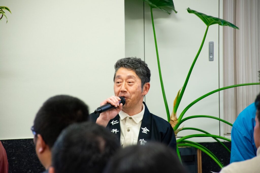 小山田氏は、「『推譲』は、二宮尊徳(金次郎)の言葉。利益が出たならば、将来の自分の為や広く社会の為にこれを還元すべきである、という考えが込められている。私はこれをまず日本の国酒である日本酒から始めた。この考え方が、これからの社会に必要だと思う。」と述べました。