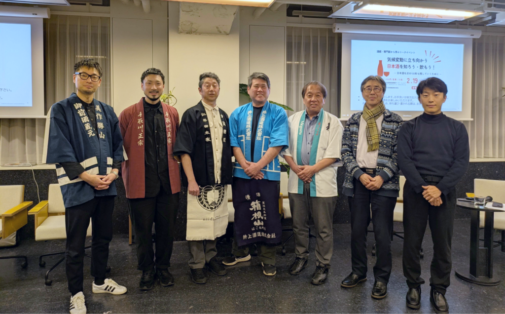2月19日、持続社会連携推進機構アース・シェルパは、ジャパン・クライメート・アライアンス*と共に、東京都千代田区の「0 Club」*イベントスペースにて、『気候変動に立ち向かう日本酒を知ろう・飲もう!』を開催しました。酒蔵・生産者・研究者・メディア関係者など約60名が参加し、登壇者からは、気候変動が日本酒造りに与える影響や、各地で進む地域・社会・環境に対しポジティブな取り組みについて共有されました。